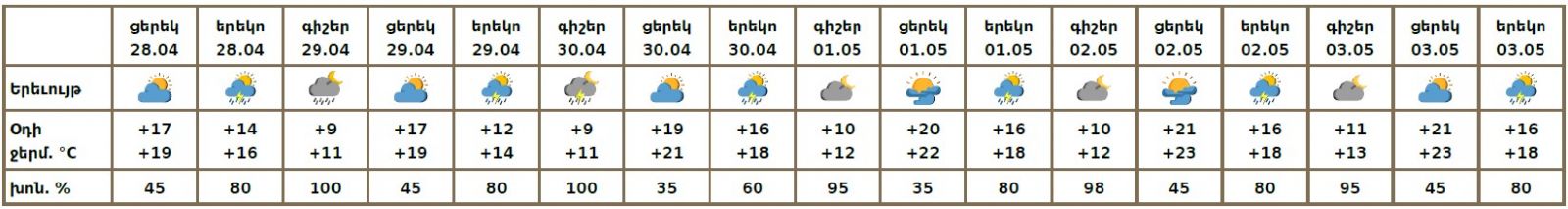 Ապրիլի 28-ին կեսօրից հետո, 29-30-ին գիշերը և կեսօրից հետո, մայիսի 1-3-ին երեկոյան ժամերին սպասվում է կարճատև անձրև և ամպրոպ, ամպրոպի ժամանակ սպասվում է նաև քամու ուժգնացում՝ 16-19մ/վ արագությամբ։