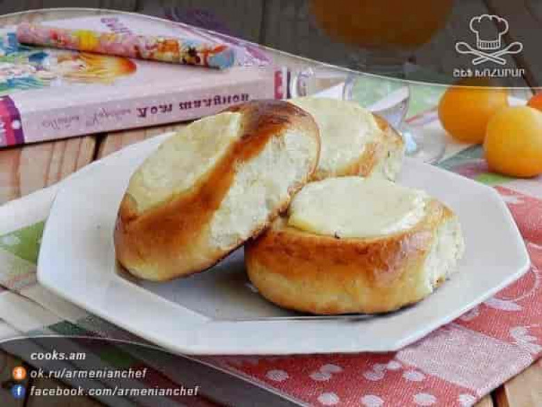 - Խմորից ոչ մեծ միանման գնդեր ենք ձևավորում, դնում ենք յուղապատ տապակի մեջ` իրարից որոշակի հեռավորության վրա։ 20 րոպե թողնում ենք, որպեսզի խմորը բարձրանա։ Այնուհետև յուրաքանչյուր գնդի մեջտեղի հատվածում փորվածք ենք անում և միջուկը լցնում մեջը։