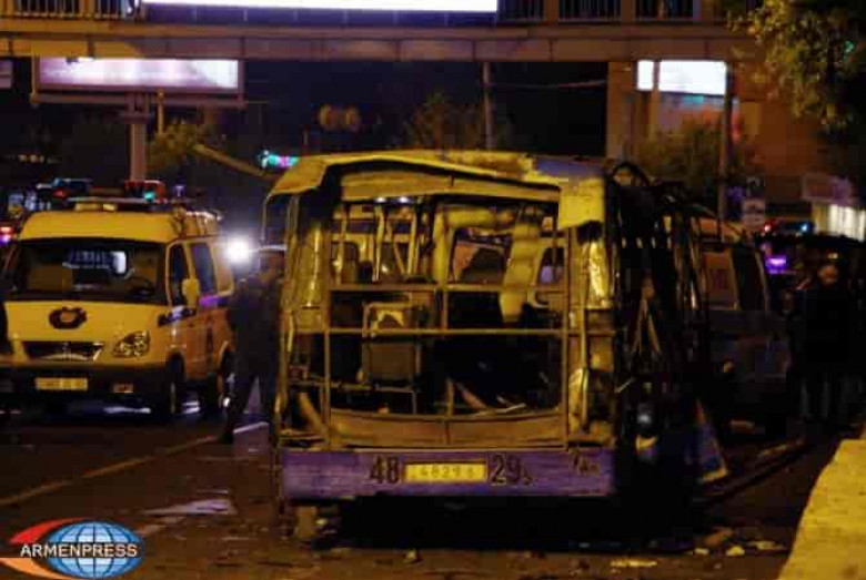 Երևանի Հալաբյան-Արզումանյան փողոցների խաչմերուկում ապրիլի 25-ի երեկոյան ավտոբուս է պայթել, որի հետևանքով ապրիլի 26-ի ժամը 04.20-ի դրությամբ կա 8 տուժած և 2 զոհ (նրանց ինքնությունը պարզվում է):