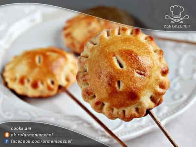 - Տապակի մեջ յուղաթուղթ ենք դնում, խմորից կտրած շրջանները դնում ենք վրան և դրանց վրա փայտիկներ ենք հագցնում, որից հետո խմորը թեթևակի սեղմում ենք, որպեսզի փայտիկը ծածկենք։