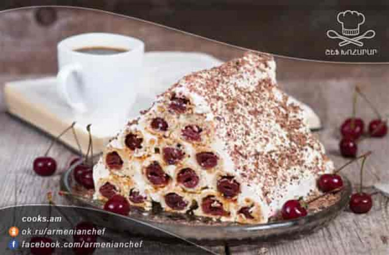 - Ապա մնացած կրեմով ամբողջությամբ պատում ենք տորթը ու վրան շաղ տալիս քերած շոկոլադը: Պատրաստի թխվածքը թողնում ենք 4-5 ժամ, որպեսզի կրեմը ներծծվի և կարելի է մատուցել: