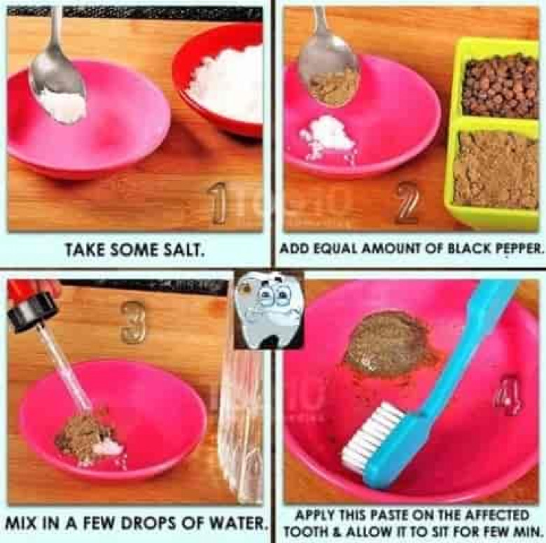 Խառնուրդը պատրաստելու համար՝ հավասար քանակությամբ վերցրեք սև աղացած պղպեղն ու աղը: Ավելացրեք մի քանի կաթիլ ջուր և խառնեք, կստանաք խյուս: Ստացված խյուսը քսեք վնասված ատամին, թողեք մնա մի քանի րոպե: Մի քանի օր շարունակ կրկնեք այս պրոցեդուրան: