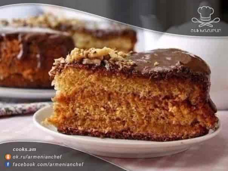 Տորթի վերևամասում ջնարակ ենք լցնում և մեջտեղի հատվածում ընկույզ ցանում: Կարող ենք անմիջապես համտեսել: