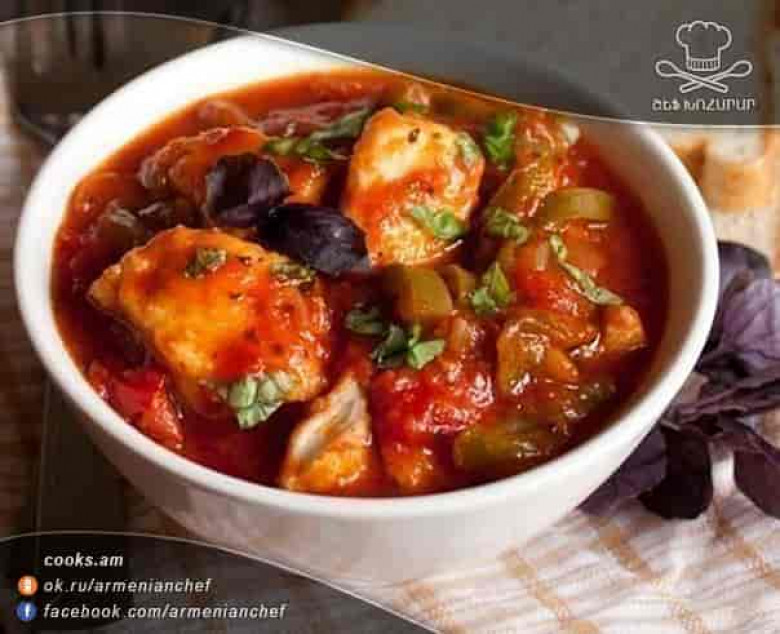 - Այհուհետև ավելացնում ենք մի կողմ դրած ֆիլեն։ Այդ զանգվածին ավելացնում ենք լոլիկի խյուսը, հասցնում եռման աստիճանի և 20-25 րոպե շոգեխաշում։
