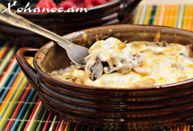 LifeԲաղադրամասեր 500 գ սունկ շամպինիոնին՝ 50 գ պանիր, 50 գ սոխ, 500 գ հավի կրծքամիս, 50 գ կարագ, 50 գ ալյուր, 200 գ կաթ, ձեթ, աղը, պղպեղը՝ ըստ ճաշակի Պատրաստման եղանակը Հավի կրծքամիսը տապակել մինչև դարչնագույն դառնալը, այնուհետև պատրաստել սոխառած, վրան ավելացնել մանր կտրտած սունկ և կտրտած կիսաեփ հավի կրծքամիսը: Ալյուրը լցնել տապակը, 1 - 2 րոպե հետո ավելացնել կարագը և կաթը, եփել 5 րոպե: Ստացված զանգվածը լցնել հավի կրծքամսի և սունկի վրա, վրան քերել պանիրը: Դնել ջեռոցը 180՞ տակ և թողնել 15 րոպե: