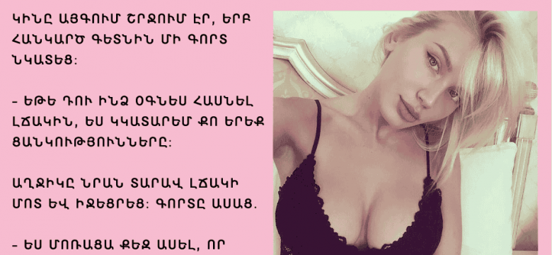 - Ես մոռացա քեզ ասել, որ կա մի պայման. ինչ էլ որ դու ցանկանաս, այդ նույն ցանկությունը 10 անգամ շատ կկատարվի քո նախկին ամուսնու համար: