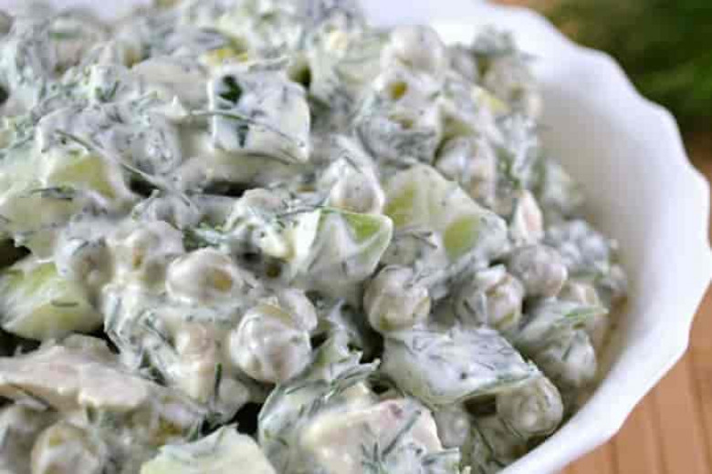 Առանձին ամանի մեջ խառնել կտրատված վարունգը, ձաձկամիսը, սամիթն ու պահածոյացված կանաչ ոլոռը: