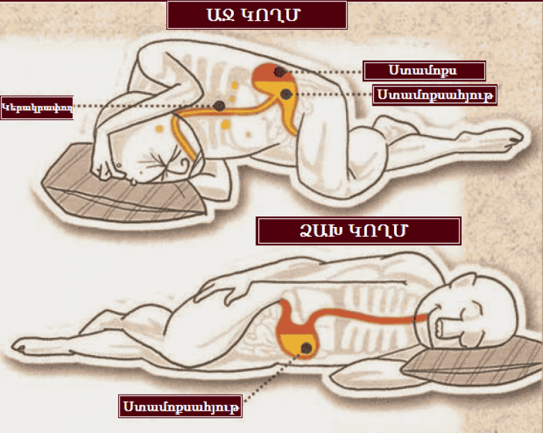 ♦ Աջ կողմի վրա պառկելը կարող է հանգեցնել մարսողական խնդիրների։ Ավշային համակարգի աշխատանքի դանդաղեցումը կանգնեցնում է օրգանիզմից թույների արտազատման գործընթացը, ինչը բարձրացնում է որևէ մահացու հիվանդություն ձեռք բերելու հավանականությունը։