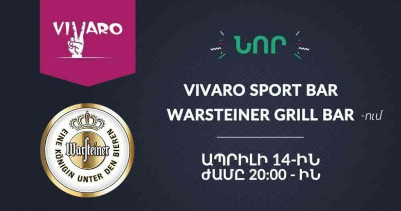 Եվ ահա ապրիլի 14-ին, Երևանի կենտրոնում՝ Թումանյան1 13\1 հասցեում գտնվող Warsteiner GRILL BAR-ում, ժամը 20։00-ին կբացվի ևս մեկ հարմարավետ և հաճելի վայր հատուկ նրանց համար, ովքեր գնահատում են սպորտը և հաճելի ժամանցը։
