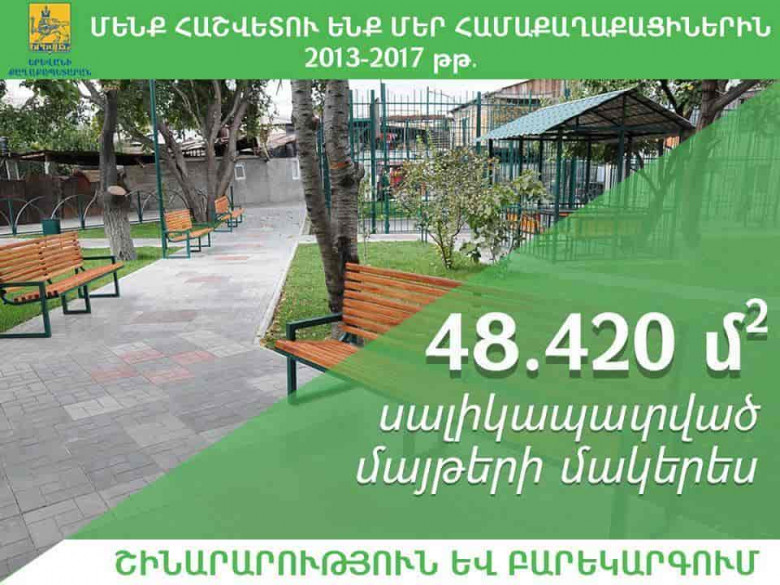 Ըստ 2013-2017թթ. շինարարության և բարեկարգման ոլորտի ցուցանիշների Երևանում սալիկապատված մայթերի մակերեսը կազմում է 48.420 քմ:
