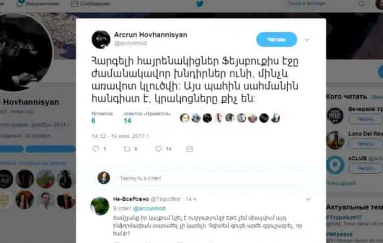 Կոտրել են Արծրուն Հովհաննիսյանի ֆեյսբուքյան էջը