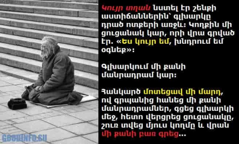 LifeԿույր տղան նստել էր շենքի աստիճաններին՝ գլխարկը դրած ոտքերի առջև: Կողքին մի ցուցանակ կար, որի վրա գրված էր. «Ես կույր եմ, խնդրում եմ օգնեք»: Գլխարկում մի քանի մանրադրամ կար: Հանկարծ մոտեցավ մի մարդ, ով գրպանից հանեց մի քանի մանրադրամներ, գցեց գլխարկի մեջ, հետո վերցրեց ցուցանակը, շուռ տվեց մյուս կողմը և վրան մի քանի բառ գրեց: Շուտով գլխարկը սկսեց ավելի շատ լցվել: Որոշ ժամանակ անց տղամարդը հետ եկավ, որպեսզի տեսնի, թե ինչպես են կույր տղայի գործերը : Տղան ճանաչեց նրան ձայնը և հարցրեց. «Դու ի ՞նչ ես գրել, դու փոխեցիր իմ ցուցանակի վրա գրվածը »: Տղամարդը պատասխանեց, որ ցուցանակի վրա գրել է ճշմարտությունը, այն ինչ որ ինքն էր գրել, սակայն այլ տարբերակով: Ես գրել եմ. «Այսօր գեղեցիկ օր է, սակայն ես այն չեմ տեսնում»: Ի՞նչ եք կարծում. Ցուցանակի վրա գրված առաջին և երկրորդ նախադասությունները նույն բանը չէին հաղորդում: Իհարկե, երկու դեպքում էլ ասվում էր, որ տղան կույր է, սակայն ի տարբերություն առաջինի՝ երկրորդը մարդկանց հաղորդում էր, որ իրենց բախտը բերել է, քանի որ իրենք կույր չեն: Այս պատմության էությունն այն է, որ պետք է շնորհակալ լինենք մեր ունեցածի համար, մտածենք այլ կերպ ու դրական ձևով: Երբ կյանքը մեզ տալիս է հարյուր պատճառ լացելու համար, մենք պետք է կյանքին ցույց տանք հազար պատճառ ժպտալու համար: Նյութը հրապարակման պատարստեց՝ GoodInfo.su (http://goodinfo.su/?p=57269)-ն