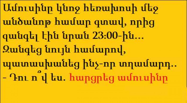 Ամուսինը կնոջ հեռախոսի մեջ անծանոթ համար գտավ, որից զանգել էին 23։00-ին Զանգեց նույն համարով, պատասխանեց ինչ-որ անծանոթ տղամարդ․․ Դու ո՞վ ես․ հարցրեց ամուսինը