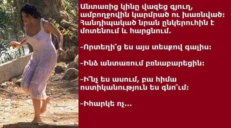 LifeԱնտառից կինը վազեց գյուղ, ամբողջովին կարմրած ու խառնված: Հանդիպակած նրան ընկերուհին է մոտենում և հարցնում.