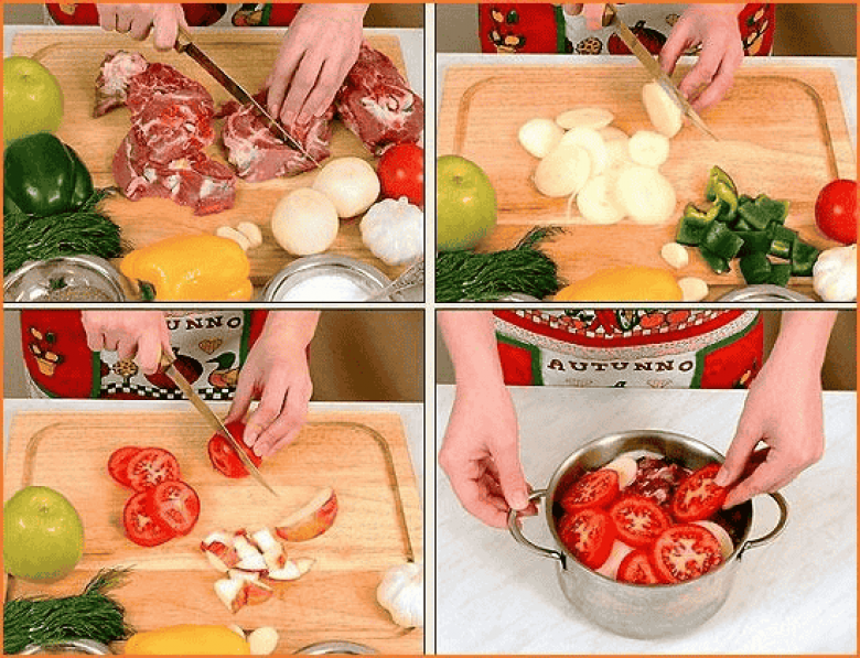 Այնուհետև ավելացնում ենք միջին կտորներով կտրատած գազարը։ Այժմ ավելացնում ենք կարտոֆիլը։ Կարող ենք նաև սմբուկ ավելացնել։ Կարմիր տաքդեղը բավական խոշոր կտրատում ենք և շարում կարտոֆիլի վրա։ Աղ ենք անում, և վերջում շարում ենք շրջանաձև կտրատած լոլիկները։ 2 բաժակ ջուր ենք ավելացնում։ Կափարիչը ծածկում ենք և դնում թույլ կրակի վրա և 2-2,5 ժամ թողնում ենք շոգեխաշվի։ Վերջում ճզմած սխտոր ենք ավելացնում։