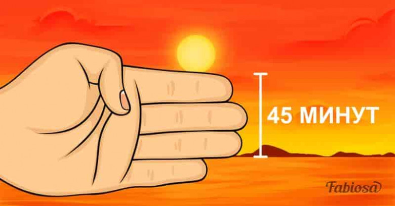 Сложите пальцы и вытяните руку в направлении Солнца так, чтобы оно “лежало” на указательном пальце. Сосчитайте количество пальцев от Солнца до линии горизонта. Каждый из них будет равен примерно 15 минутам до заката.