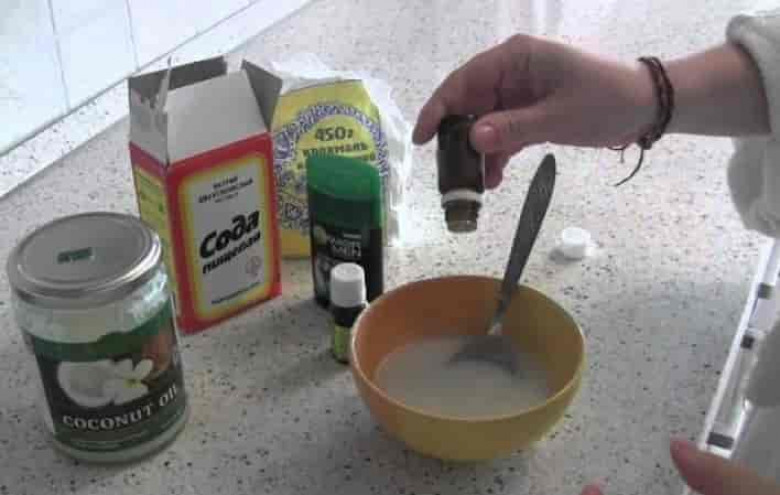 Իրար խառնեք սոդան ու եգիպտացորենի օսլան, ապա ավելացրեք կոկոսի յուղը: Թույլ կրակի վրա տաքացրեք այս զանգվածը, ավելացրեք որևէ տեսակի եթերային յուղ: