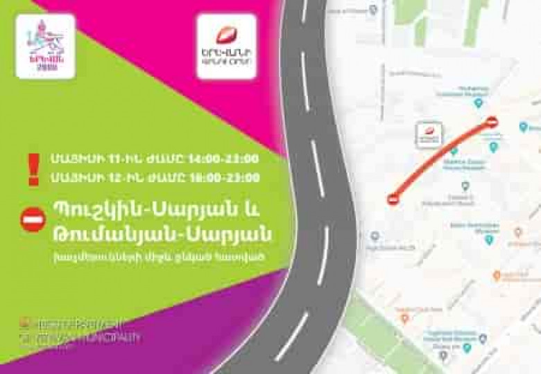 մայրաքաղաքում նախատեսված «Երևանի գինու օրեր» միջոցառման պատշաճ և անվտանգ կազմակերպման նպատակով մայիսի 11-ին՝ ժամը 14:00-23:00- ը և մայիսի 12-ին՝ ժամը 16:00-23:00- ը Երևանի Պուշկին-Սարյան և Թումանյան-Սարյան խաչմերուկների միջև ընկած հատվածում կսահամանափակվի ավտոտրանսպորտային երթևեկությունը:
