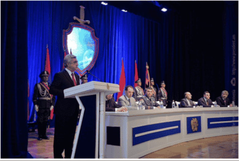 Ուշադրության կենտրոնումՀայաստանի Նախագահ Սերժ Սարգսյանը մայիսի 16-ին մասնակցել է ՀՀ ոստիկանության օրվա 97-րդ տարեդարձին նվիրված հանդիսավոր նիստին: Ինչպես տեղեկացրին ՀՀ նախագահի աշխատակազմի հասարակայնության և տեղեկատվության միջոցների հետ կապերի վարչությունից, Սերժ Սարգսյանը մասնագիտական տոնի առթիվ շնորհավորել է ոստիկաններին: Նախագահի հրամանագրերով ոստիկանության մի շարք ծառայողներ արժանացել են ՀՀ պետական պարգևների, շնորհվել են նաև բարձրագույն կոչումներ: Սերժ Սարգսյանը հանդիսավոր նիստի ժամանակ հանձնել է պետական պարգևները, շնորհավորել և նոր հաջողություններ մաղթել պարգևատրվածներին:
