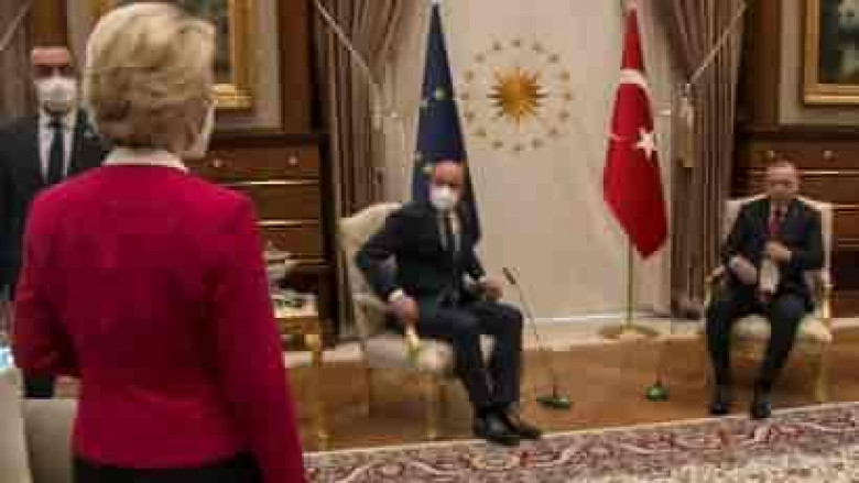 Глава Еврокомиссии, которая сначала вместе с Эрдоганом и Мишелем направилась к стульям для лидеров, осталась стоять, разведя в недоумении руками и пробормотав: «Эмм…», а затем села в стороне от лидеров на диван напротив министра иностранных дел Турции Мевлюта Чавушоглу, который по дипломатическому протоколу занимает более низкий ранг.
