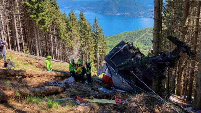 Инцидент произошел на канатной дороге, соединяющей населенный пункт Стреза на берегу озера Лаго Маджоре и гору Монтероне высотой почти полторы тысячи метров. Обрушение линии фуникулера произошло за 300 метров до вершины горы, в районе последнего пилона, на максимальной высоте. На фото с места видно, что серьезно поврежденный вагон лежит на просеке в лесном массиве.