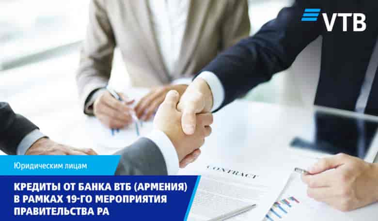 ОбществоБанк ВТБ (Армения) в рамках 19-го мероприятия Правительства РА по нейтрализации экономических последствий COVID19, проводимого совместно с Министерством экономики РА и Фондом “Центр поддержки инвестиций”, объявляет о кредитовании малого бизнеса и содействия в реализации бизнес-проектов предпринимателей этого сегмента.