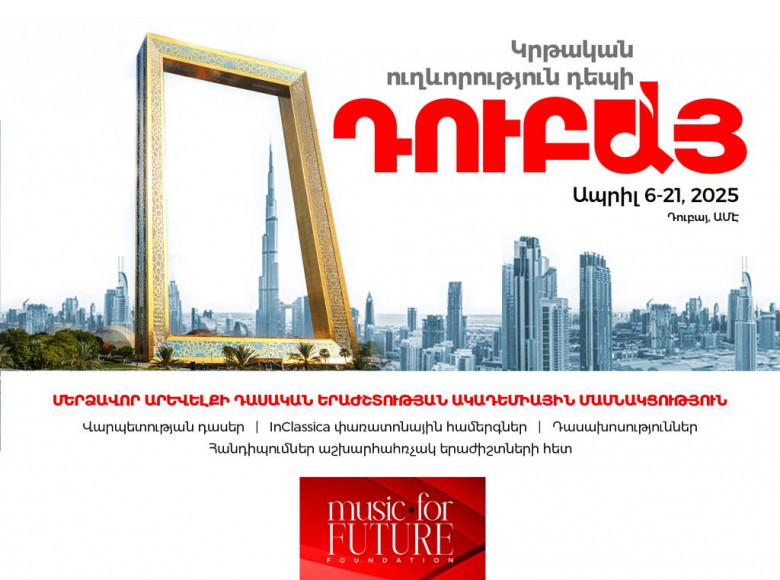 Ближневосточная Академия классической музыки совместно с фондом «Музыка во имя будущего» Армении предлагают уникальную возможность совершить поездку в Дубай с целью участия в Ближневосточной Академии классической музыки (Middle East Classical Music Academy-MECMA), которая состоится с 6 по 21 апреля 2025 года. Возможность участия в программе имеют юные музыканты, являющиеся учениками музыкальной школы и школы искусств /колледжа/консерватории Армении, которым на момент подачи заявки от 12 до 18 лет (18 включительно), и которые учатся по следующим направлениям: струнные инструменты (скрипка, альт, виолончель), духовые инструменты (флейта, гобой, кларнет, фагот, свирель, труба, тромбон, саксофон) и фортепиано. В программе также могут принять участие учителя и преподаватели музыкальных учебных заведений в качестве пассивных участников всех мастер-классов и лекций.