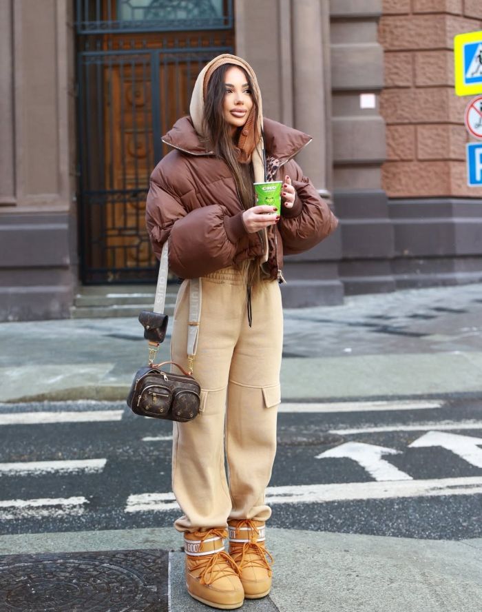 В образе Мариетты Кочарян считывается один из ключевых трендов последних сезонов - functional chic. Спортивный костюм с карго-брюками и пуховик работают как база, но за счёт аккуратной цветовой гаммы и чётких форм образ не уходит в «домашний». Moon Boot здесь - не просто тёплая обувь, а модный маркер après-ski эстетики, которая давно вышла за пределы курортов. Сумка Louis Vuitton добавляет образу нужный уровень «собранности» и визуального веса.