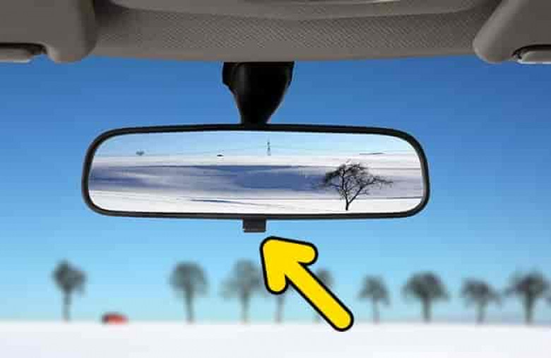 Это переключатель «день — ночь», позволяющий избежать ослепления водителя ночью от света фар идущего сзади автомобиля. Дело в том, что зеркала заднего вида имеют двойное отражающее покрытие, которое всегда можно поменять с помощью одного нажатия на переключатель. Лайфхак, который будет особенно ценен для новичков-автомобилистов.